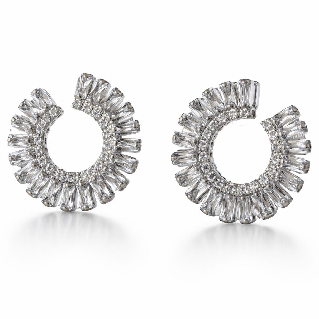 Rodio y Zirconia Cúbica. Nuestros Aretes Caia circulares. Su diseño abierto y armonioso captura la luminosidad en cada ángulo, aportando elegancia y distinción. Una pieza versátil y protagonista que transmite sofisticación atemporal, perfecta para realzar cualquier estilo.