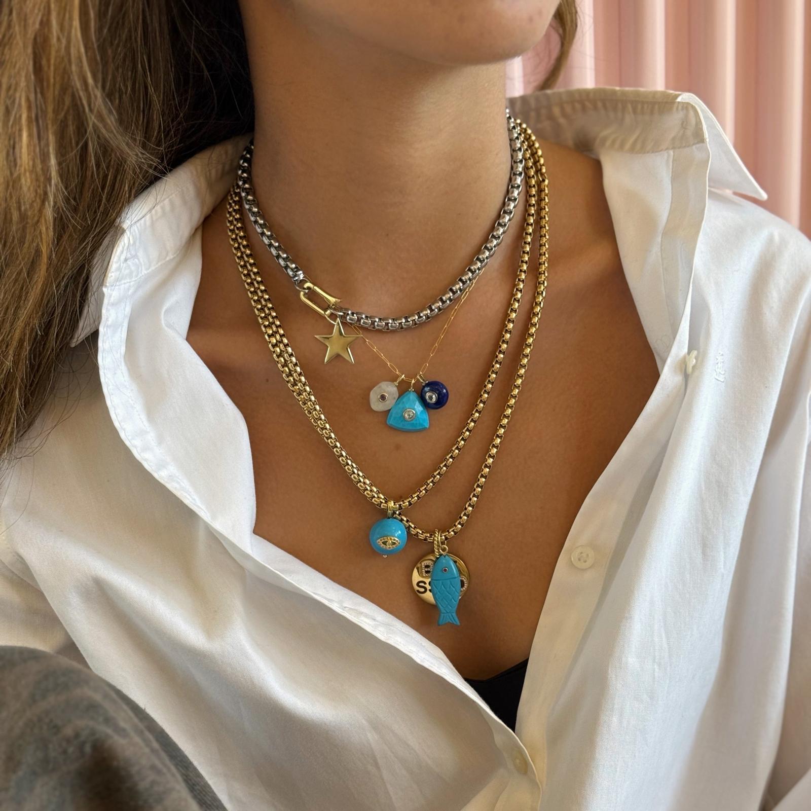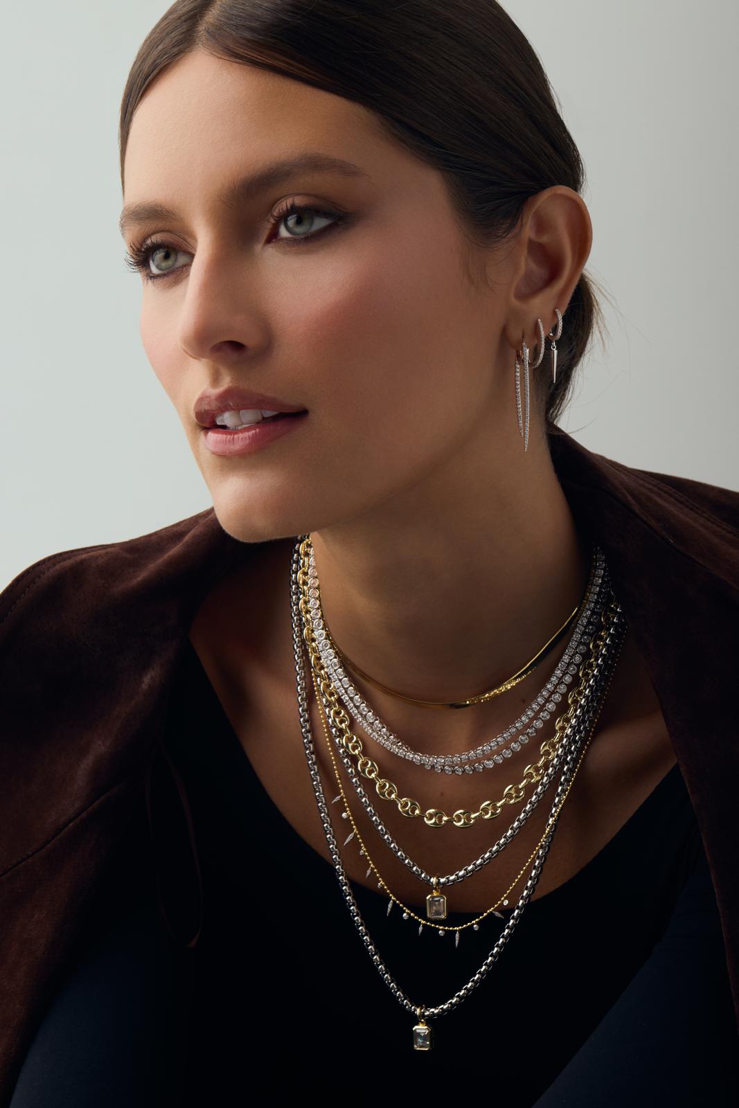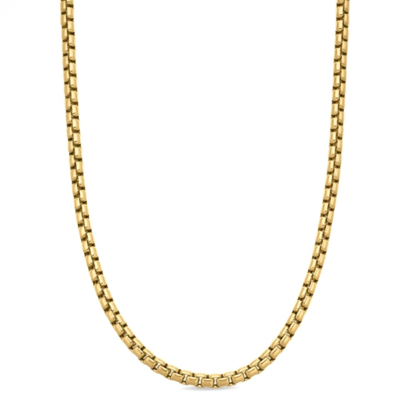 Acero inoxidable con baño en oro 18Kt. Nuestra Cadena Cauce diseño de eslabones cuadrados con acabado pulido representa el trayecto por donde fluye la energía vital, evocando continuidad y movimiento. Su diseño uniforme y elegante transmite firmeza y equilibrio, creada para mujeres que reconocen en cada enlace la fuerza de su propio recorrido.