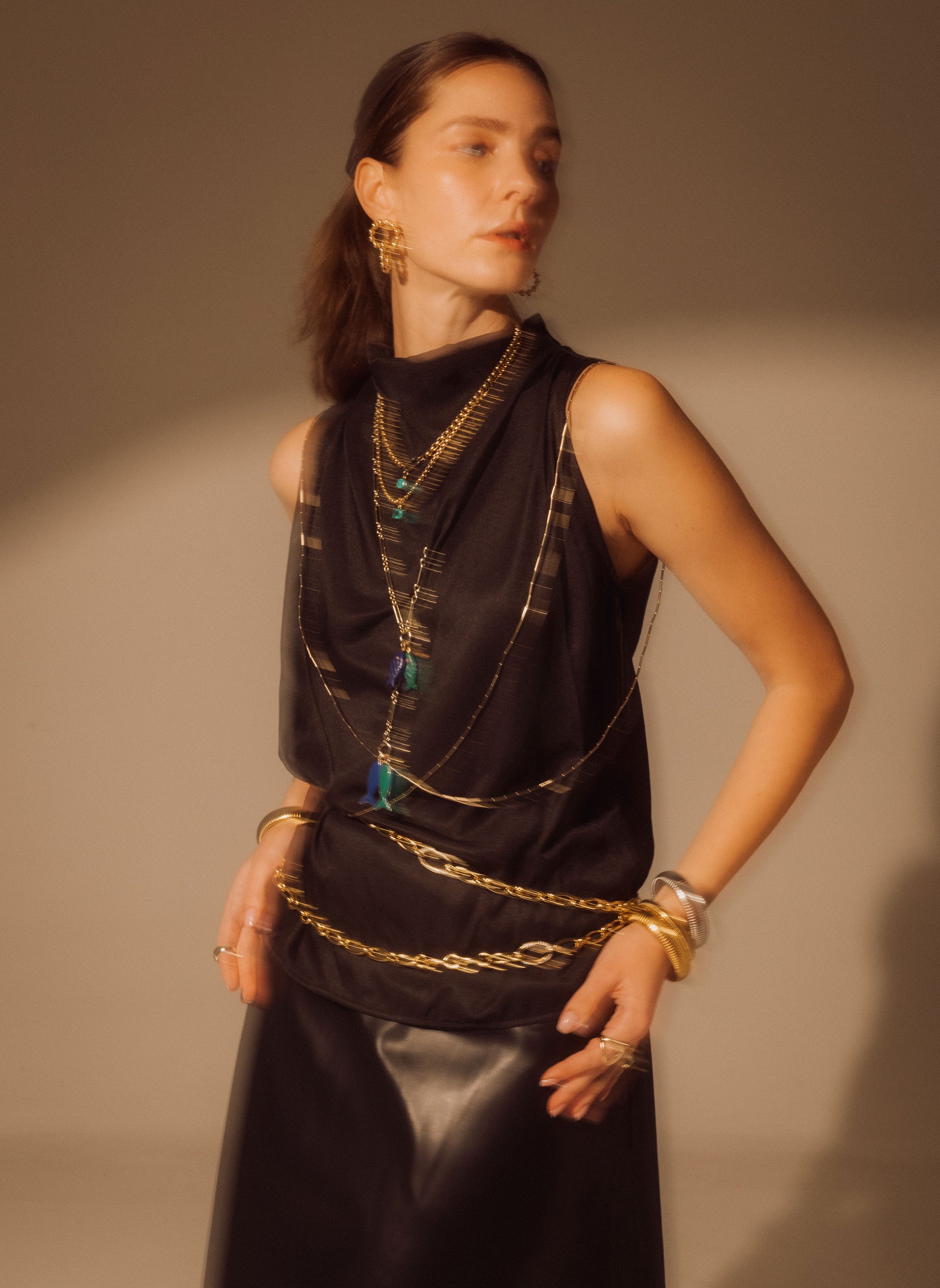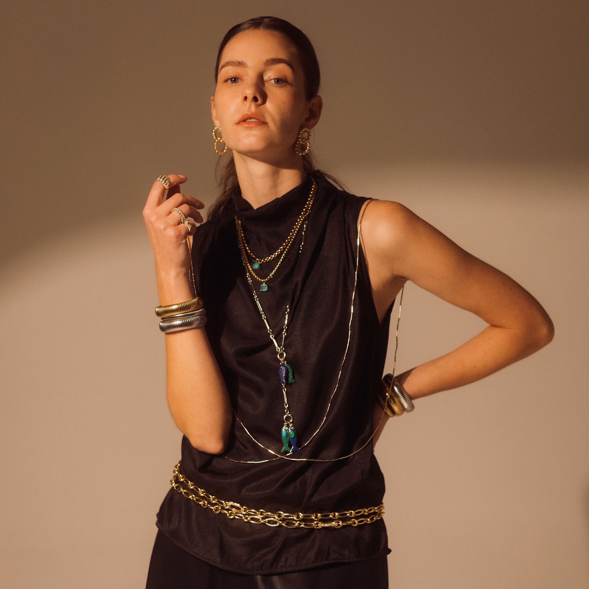 Chapada en Oro de 18 Kt. Nuestra Cadena Cintilla Dorada que danza sobre la cintura es un talismán de poder sutil: abraza sin aprisionar, resalta sin imponer. Su trazo ondulante recuerda los caminos del deseo y la fuerza que nace en el centro del cuerpo. Pensada para mujeres que se adornan con intención, que convierten cada gesto en ritual.